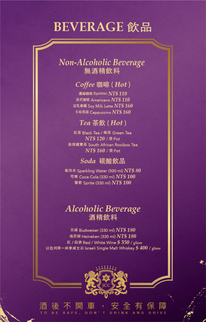 除了香濃的咖啡、果汁或茶飲之外,您也能在此享用到來自以色列,符合猶太潔食規範釀造的葡萄酒,為您的美好的用餐時間增色。