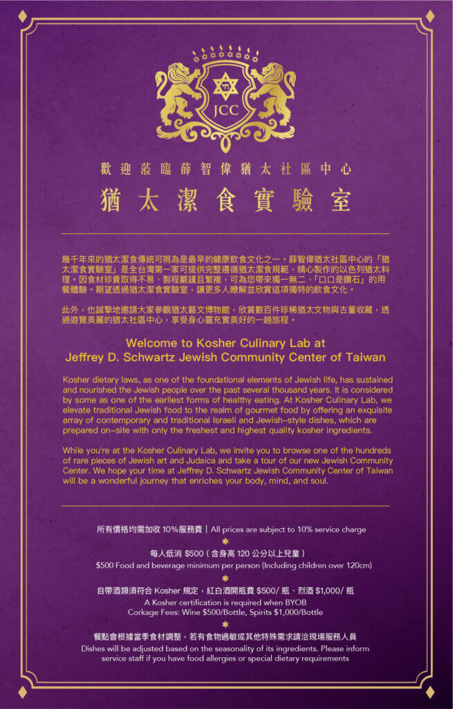 「薛智偉猶太社區中心」設有全台唯一的『猶太潔食實驗室』,邀請您來此享受獨一無二的用餐體驗。